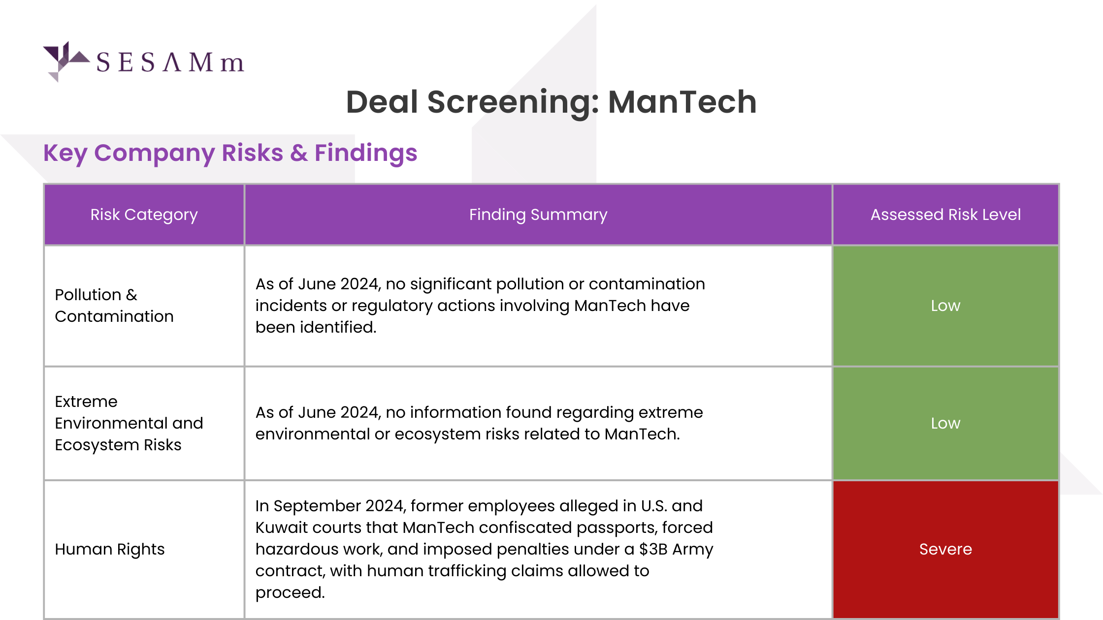 “Using SESAMm’s text analysis, we took a deep dive into investments with an ESG lens. SESAMm’s platform helped us catch potential issues early and keep track of controversies. They offered a wide range of ESG indicators, backing our sustainable investment focus with more depth of content. The platform also highlighted the main ESG events for the companies we were investigating and their competitors. Even with a tight deal timeline, SESAMm provided insights when needed. It added an additional perspective to our risk checks and ongoing monitoring. In short, SESAMm made our ESG investment considerations both sharper and quicker.”