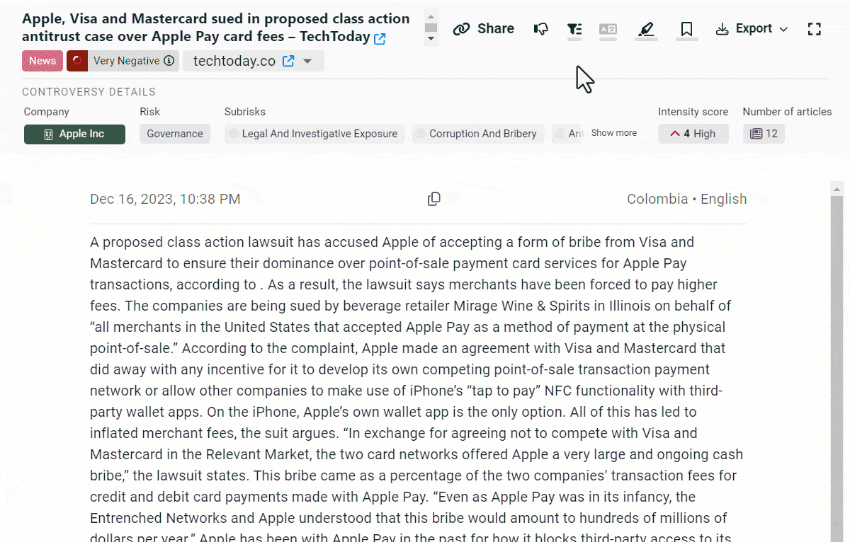 In addition to the severity, controversies are also categorized by risk and sub–risk type, making it easy to analyze specific areas of concern.