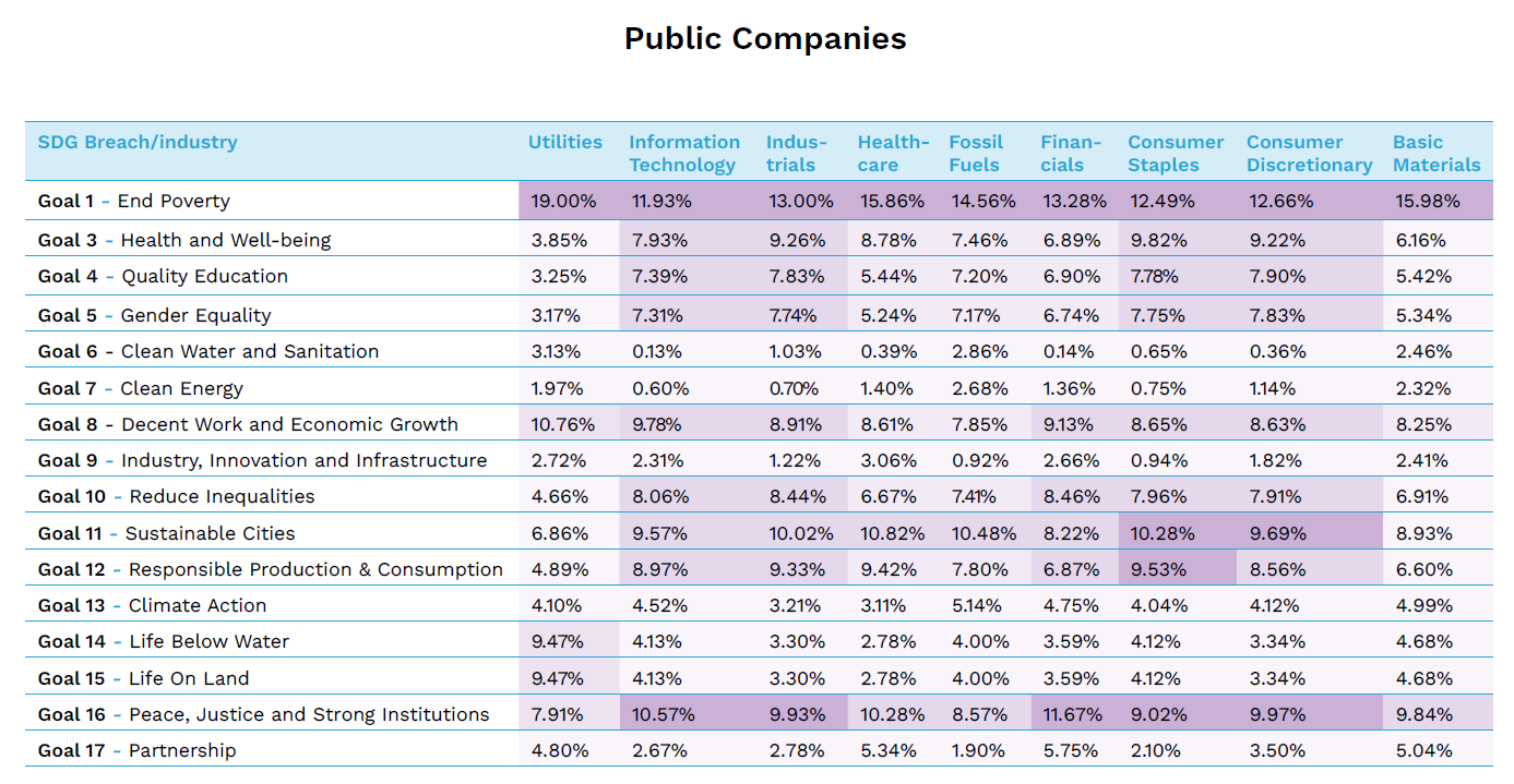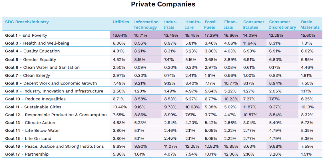Goal 16 ("Peace & justice and strong institutions") is significant in both sectors but particularly in the Financials and Information Technology for public companies and in Financials, Fossil Fuels, and Health Care for private companies. This goal involves human rights, labor rights, human capital, and governance-related controversies.